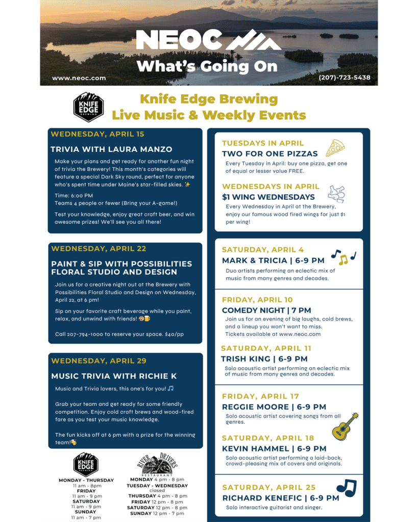 Visit a Maine craft microbrewery and wood-fired pizzeria located in the heart of the Katahdin region, near the gateway to Baxter State Park. Knife Edge Brewing offers breathtaking views, local live music, Maine craft brews, and great company.