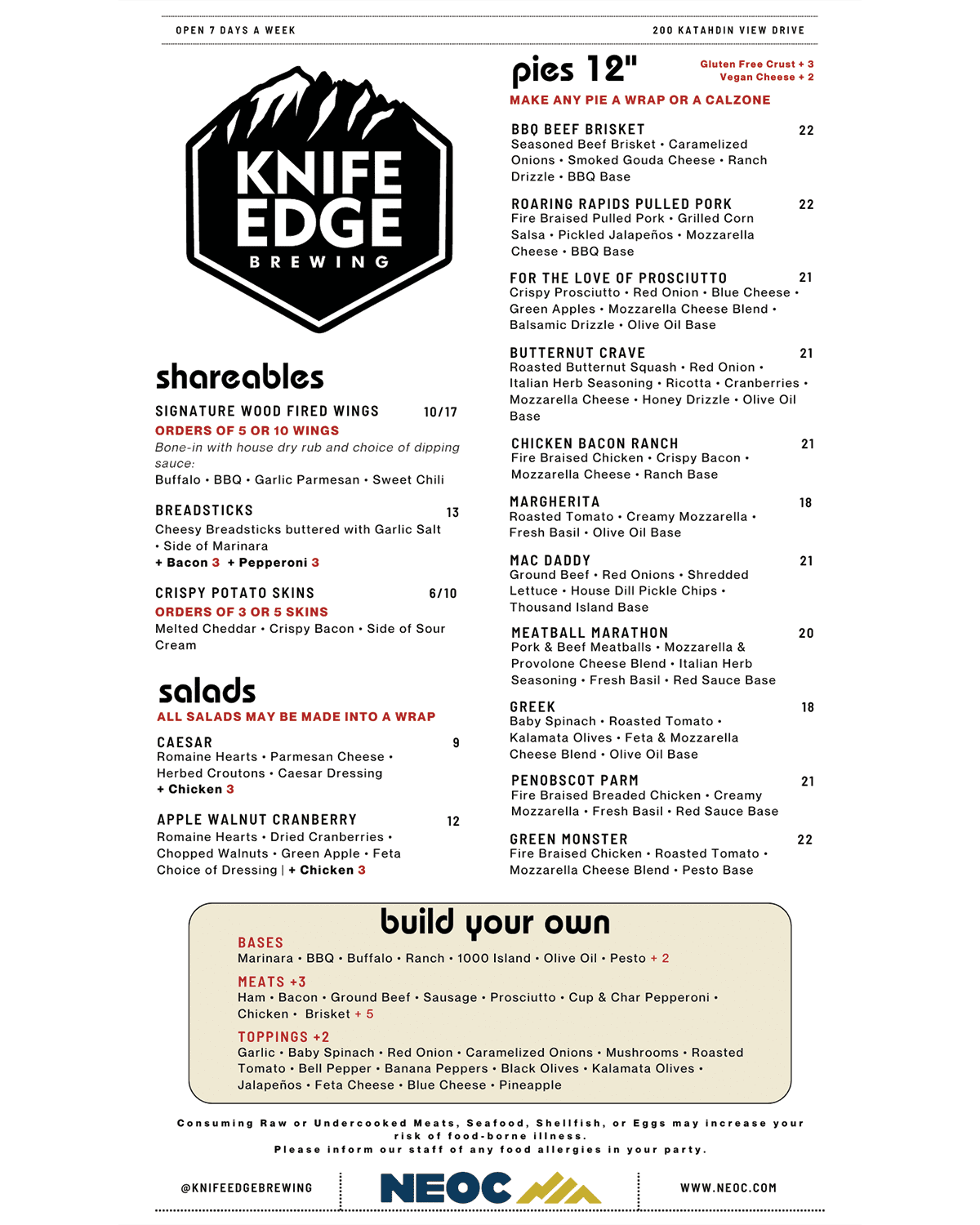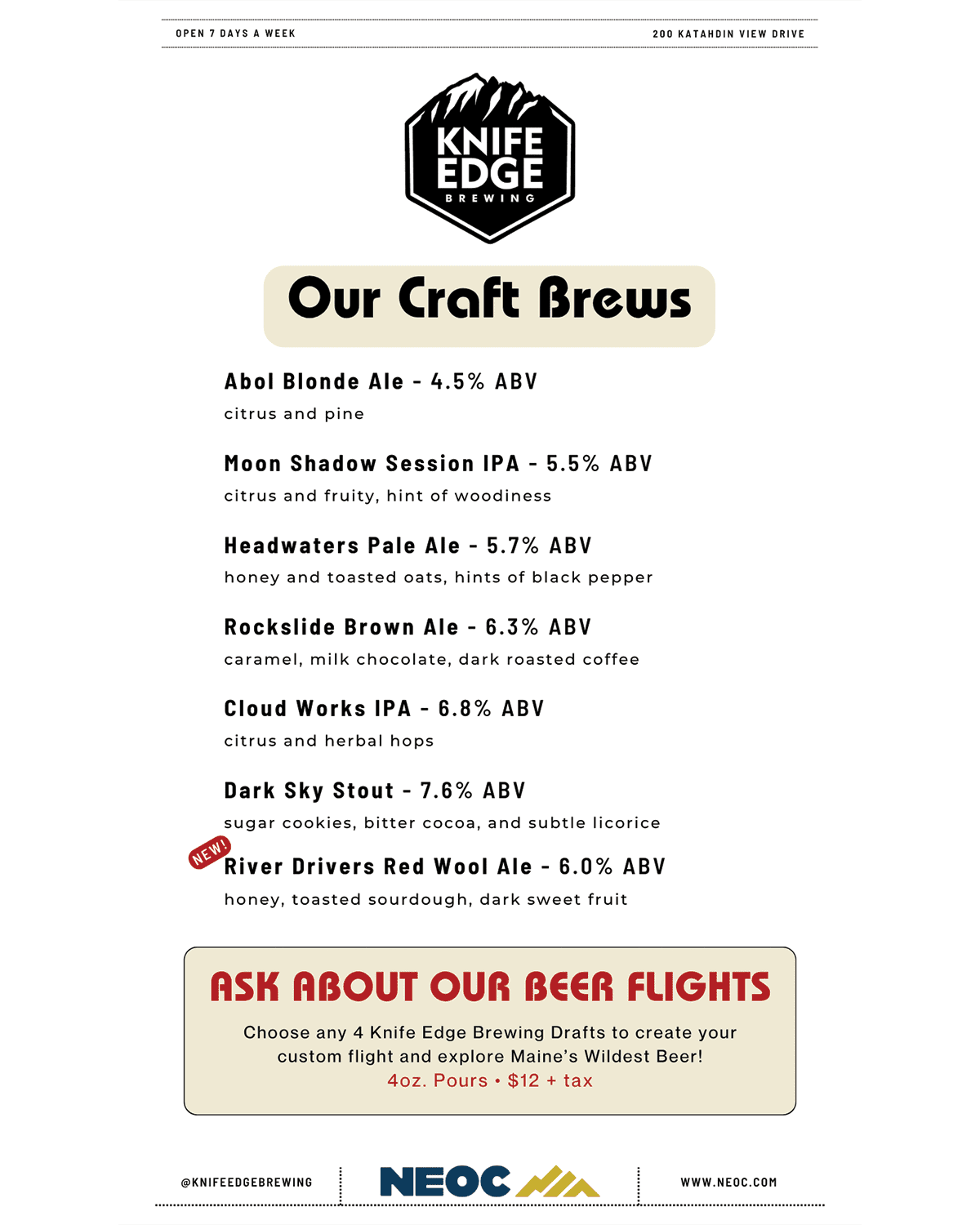 KNIFE EDGE BREWING Hours of Operation Monday: 11am - 8pm Tuesday: 11am - 8pm Wednesday: 11am - 8pm Thursday: 11am - 8pm Friday: 11am - 9pm Saturday: 11am - 9pm Sunday: 11am - 7pm Directions Events & Menu For To Go Orders: 207.723.8904 *Hours are subject to change. Please call our restaurant for the most up-to-date hours!