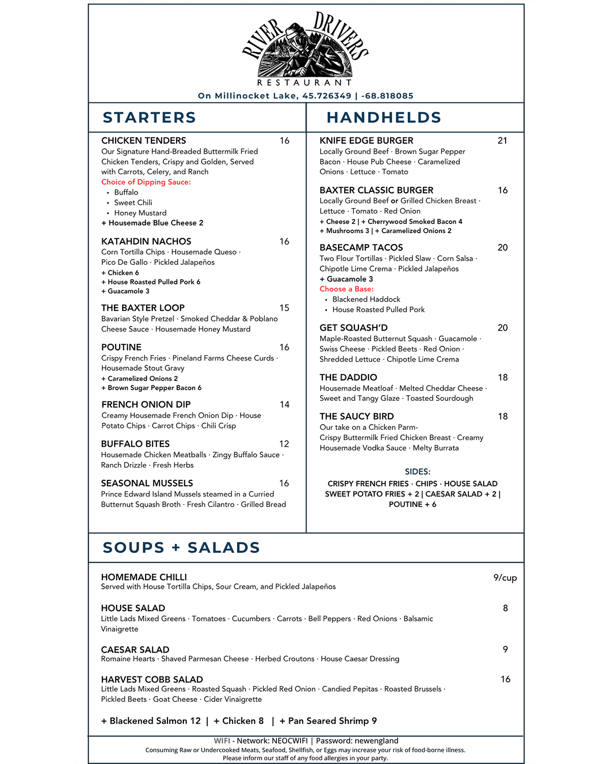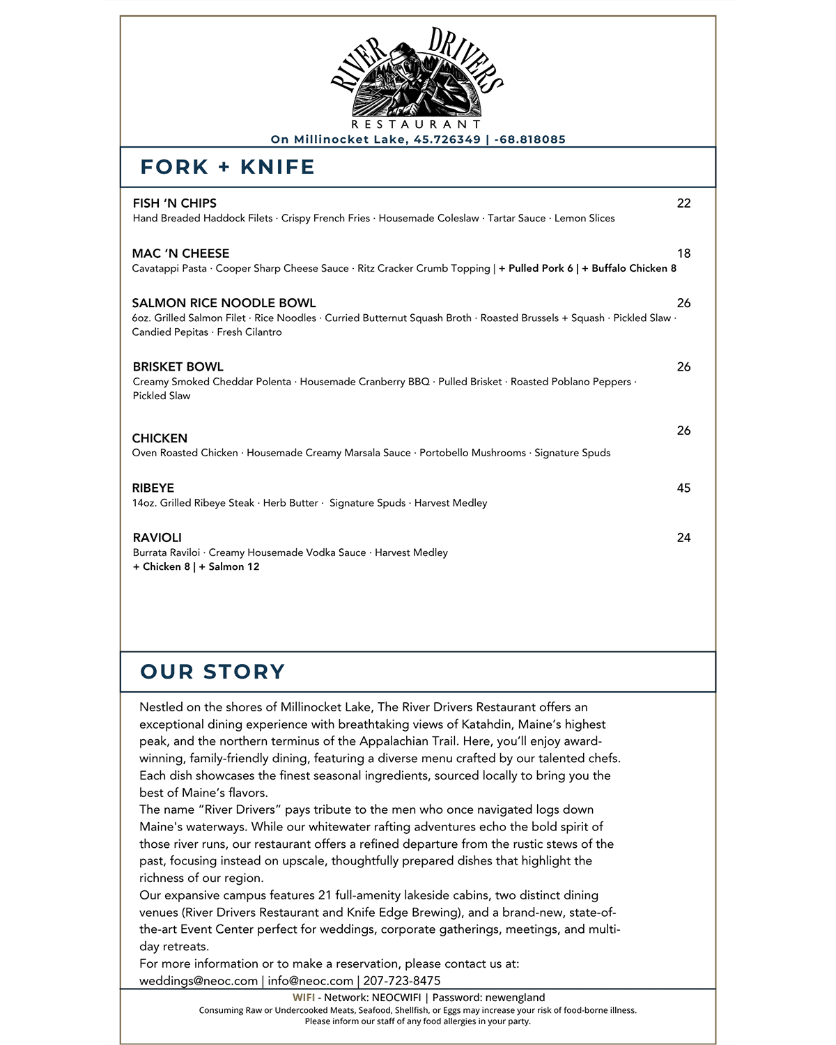 The name “River Drivers” pays tribute to the men who once navigated logs down Maine's waterways. While our whitewater rafting adventures echo the bold spirit of those river runs, our restaurant offers a refined departure from the rustic stews of the past—focusing instead on upscale, thoughtfully prepared dishes that highlight the richness of our region.