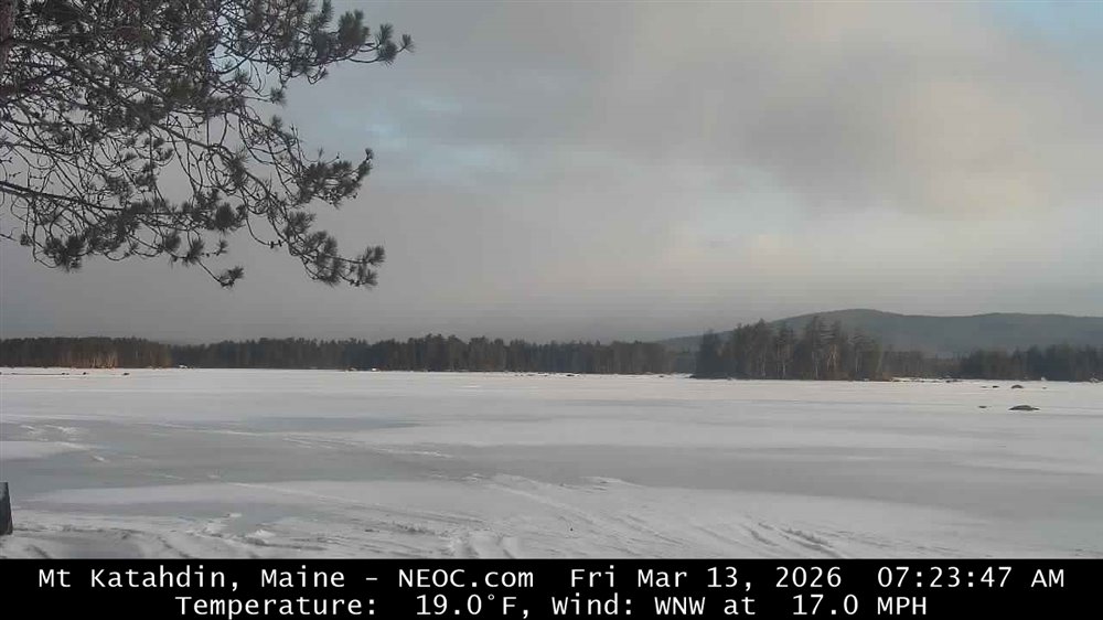 Live views of Katahdin during the day and the night sky with stars and aurora when visible.