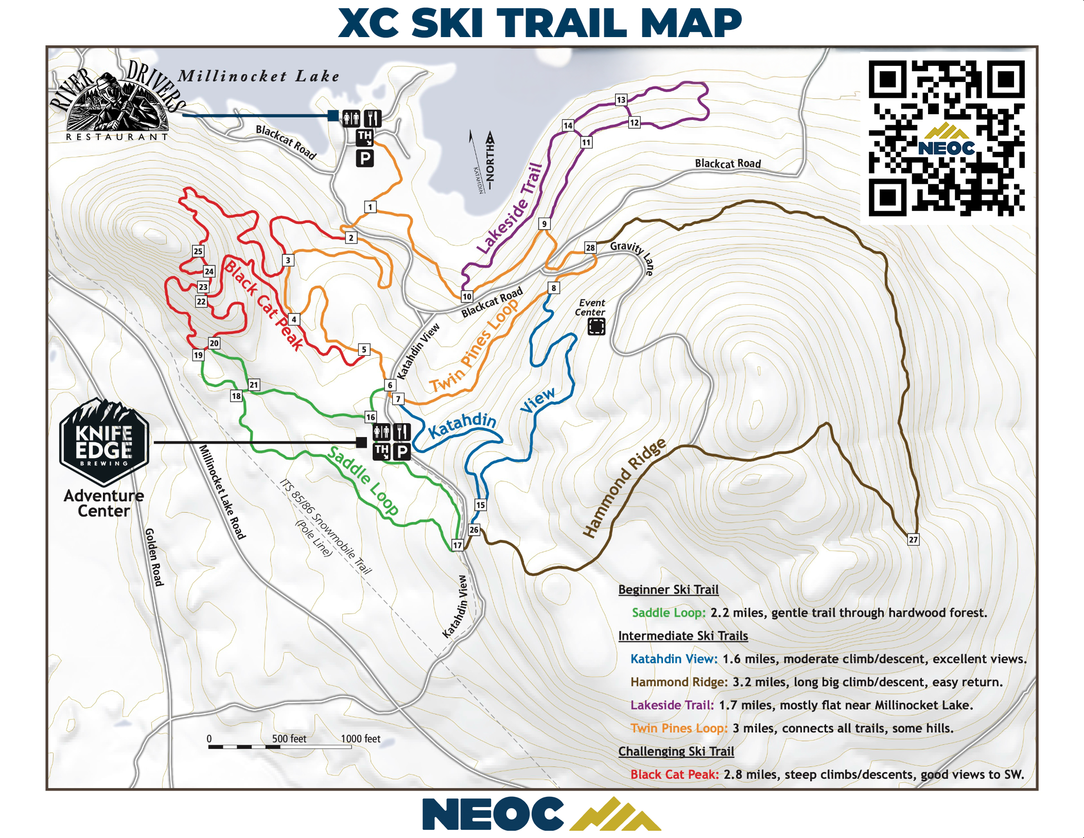 Our trail system is located right outside of our main building at NEOC. The trail system was designed by Olympian John Morton and developed by Katahdin Area Trails. The terrain on the trails consists of easy-to-moderate trails, intermediate trails, and challenging trails.